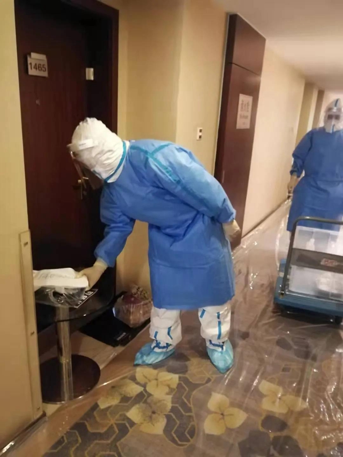 這些變化對(duì)隔離區(qū)14名服務(wù)人員是一場(chǎng)嚴(yán)峻考驗(yàn),他們默默堅(jiān)守,每天要在陳宇、吳迪兩位組長(zhǎng)帶領(lǐng)下,周海洋、楊魯琦、單雪芳、姚尚武、喬恩芳、候迪、劉克云、高劍、翟嘉豪、任艷麗、車(chē)麗娟、張鳳麗等組員要穿著厚厚的防護(hù)服為集中觀察人員送餐、送物品、搞清潔衛(wèi)生。