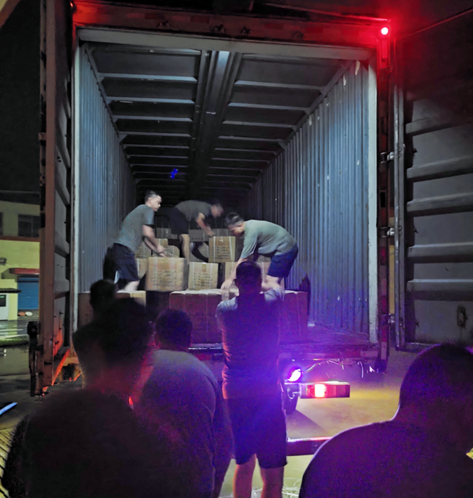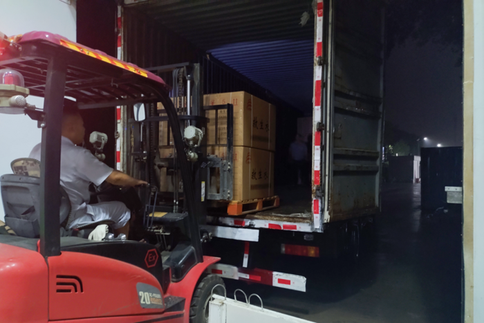 命令如山,華騰化工倉儲管理部共產黨員朱雨、劉寶玉、張月婷立即聯合公司值守人員安全保衛部共產黨員劉兵、隋紅賓緊急集合,冒雨備貨裝車。僅用時4小時就完成全部物資的裝車。