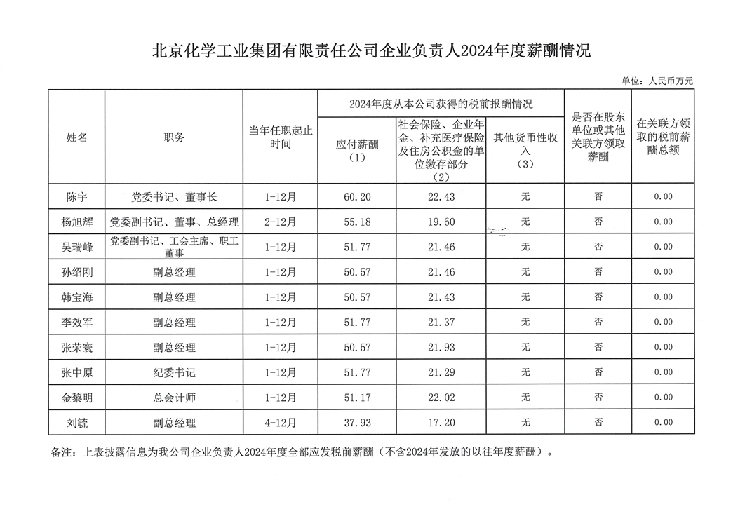 北京化學工業(yè)集團有限責任公司企業(yè)負責人2024年度薪酬情況