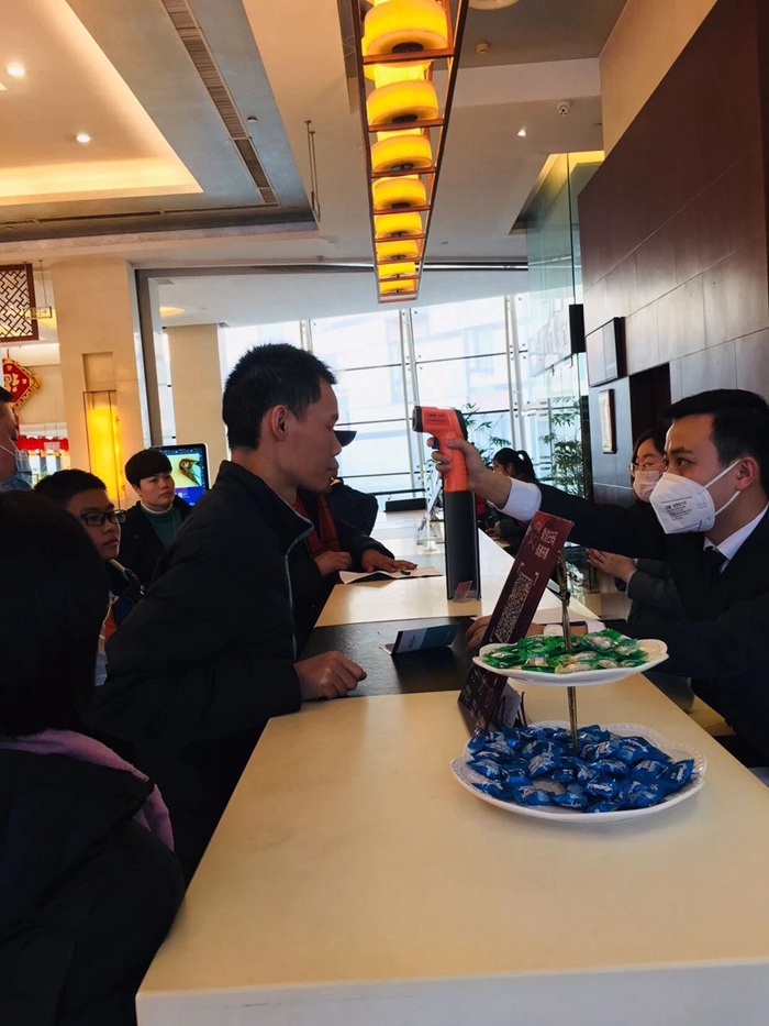 在員工保障方面,酒店為員工配置了電子測溫儀,每日上崗前都定時進行體溫測量。員工宿舍定時進行全面消毒并做好記錄,加強通風。合理安排員工餐,保證員工飲食均衡,提高員工自身抗病能力。