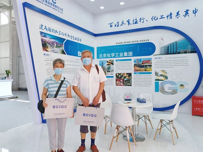 從北京化工集團退休的老員工走進集團展位,認真地觀看每一塊展板,欣賞著每一張圖景,和工作人員深情地講述自己在化工戰線上工作的情景,興奮之情溢于言表。