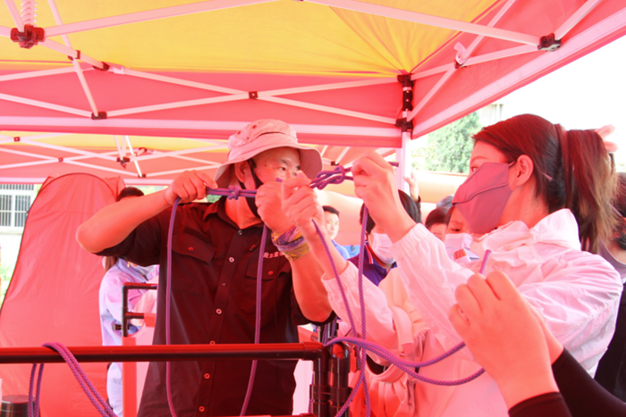 活動現(xiàn)場,專家講師在高溫天氣下,為公司職工詳細講解了心肺復(fù)蘇要領(lǐng)和AED的使用方法,開展了自救結(jié)繩演練、模擬滅火體驗、模擬通道煙霧逃生等應(yīng)急活動。