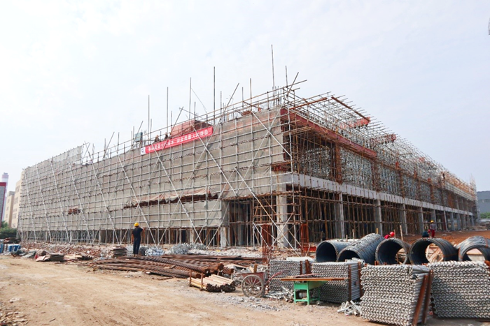 行政辦公樓已完成一層建設,二層開建在即;2#車間二、三層主體結構已經成型,立體倉庫預埋件完成基本澆筑;消防泵房土建施工已完畢,設備將入場安裝。