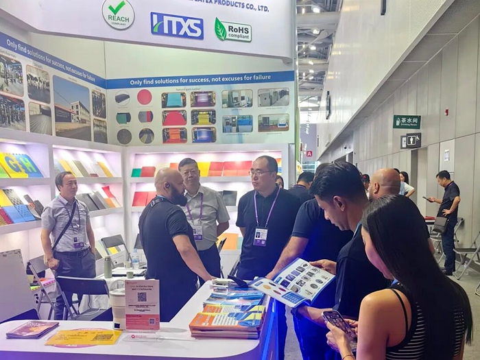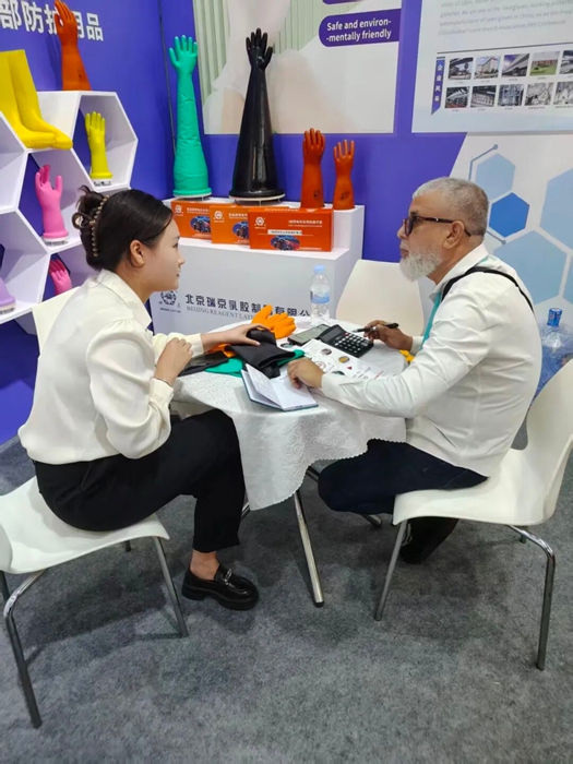 在本屆廣交會(huì)第一期,華騰橡塑與瑞京公司聯(lián)袂登場,其中華騰橡塑重點(diǎn)展示了公司創(chuàng)新研發(fā)的濕法混煉天然膠膠板產(chǎn)品;瑞京公司則帶來了“雪蓮”牌專業(yè)工業(yè)用手套系列產(chǎn)品,吸引了眾多國際客戶駐足交流,現(xiàn)場與部分客戶達(dá)成初步合作意向并計(jì)劃寄送樣品,為后續(xù)深入合作打下良好基礎(chǔ)。